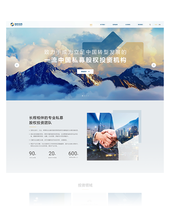 體現(xiàn)國投招商定位未來工業(yè)、專業(yè)金融感受為設(shè)計方向,結(jié)合現(xiàn)在主流扁平化、交錯呼應(yīng)的設(shè)計手法,賦予頁面效果達(dá)到穩(wěn)重高級且變化的呈現(xiàn)效果。