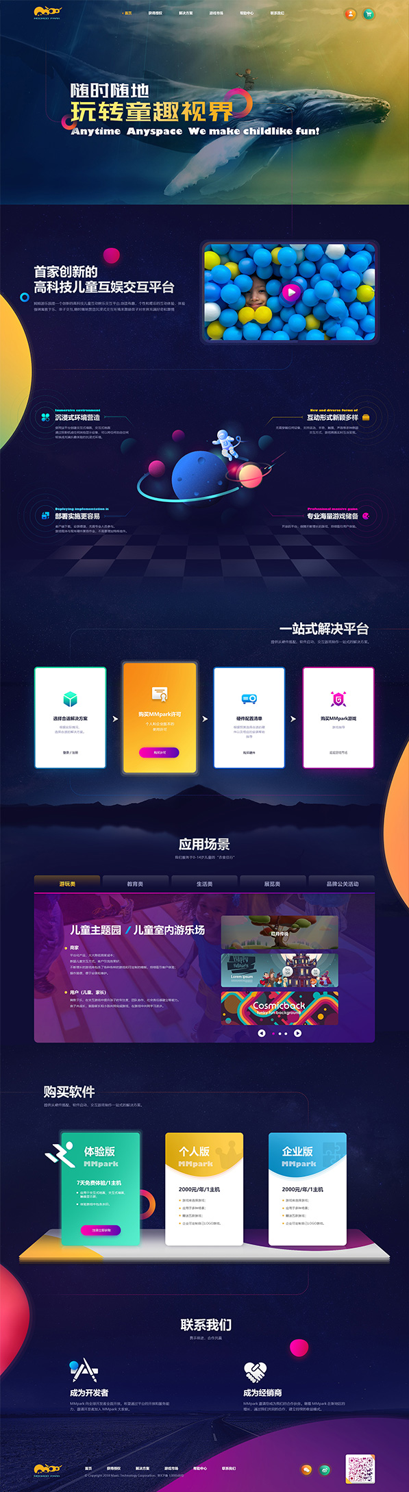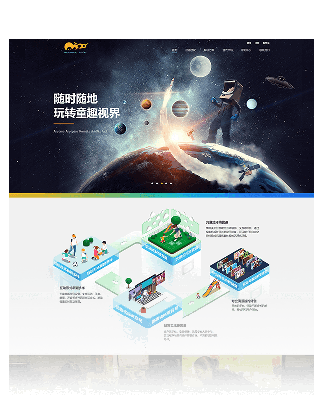 作為涉足虛擬現(xiàn)實(shí)領(lǐng)域針對(duì)兒童的產(chǎn)品,此首頁設(shè)計(jì)提案以體現(xiàn)姆姆寓樂專注兒童與虛擬互動(dòng)的科幻特性為主題,結(jié)合2.5D場(chǎng)景配圖設(shè)計(jì)手法,賦予頁面生動(dòng)形象的主題呈現(xiàn)效果。